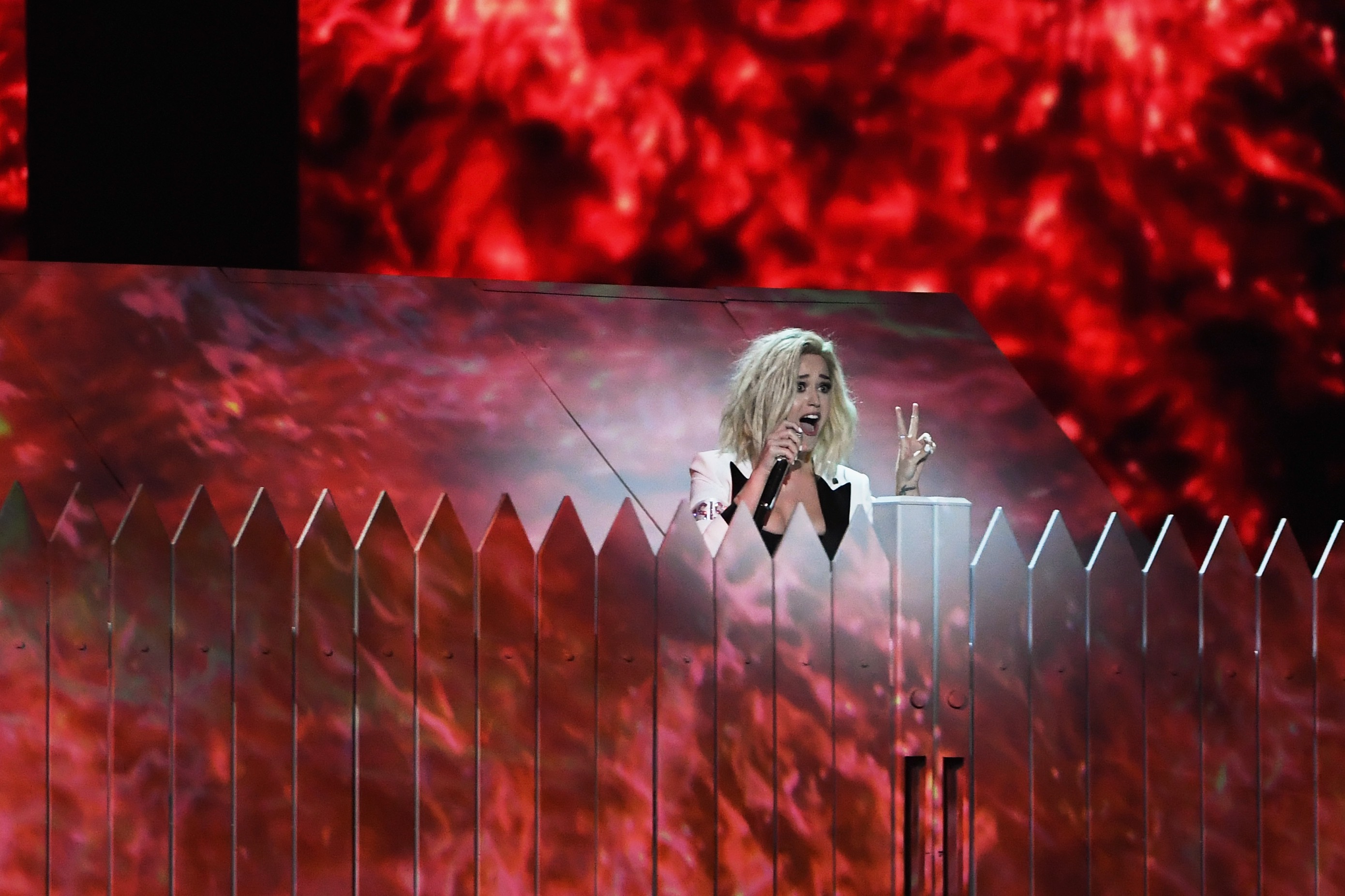 Ihr Bühnenbild war dabei von einem Gartenzaun geprägt, auf dem unter anderem bewegte Bilder von einem loderndem Feuer projiziert wurden. Außerdem spielte sie mit ihrem Kostüm, einem weißen Hosenanzug, auf die Verkleidung der Suffragetten an, die einst in Großbritannien und den USA das Wahlrecht für Frauen erstritten.