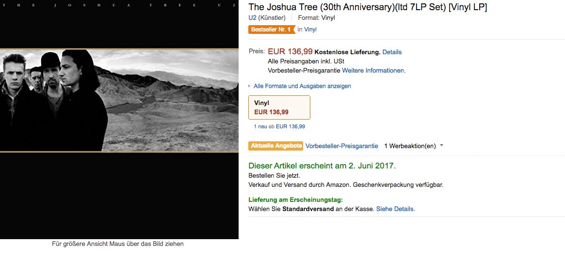 Höhepunkt ist dabei ein 7-LP-„Vinyl Super Deluxe“-Boxset . Das bekommen Fans der Band aber ganz und gar nicht hinterher geworfen. Während die 4CD-Variante bereits für 99 Euro bei Amazon feilgeboten wird, müssen für die Deluxe-Vinyl-Variante derzeit 136,99 Euro hingeblättert werden. Auf der Website von U2 gibt es das Set mit „Record Bag“ für 164,95 Euro (hinzu kommen aber noch saftige Versandkosten!).