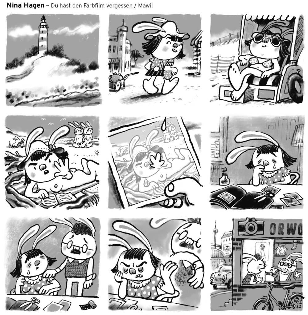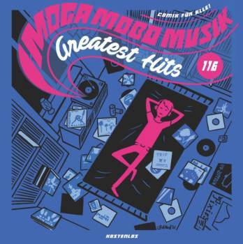 Für das Comic-Projekt „Moga Mobo Musik – Greatest Hits“ wurden 100 Zeichnerinnen und Zeichner mit der Aufgabe betraut, 100 Lieblingssongs zu covern. Von Tupac bis Roland Kaiser. Bedingung: eine Seite und 9 Panels Platz – keine Farbe und keine Worte.