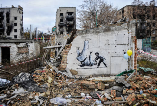 Gut zu sehen sind hingegen Banksys Hinterlassenschaften: Unter anderem hat er sich auf einer Wand in Borodjanka verewigt, von der kaum noch etwas übrig geblieben ist. Das Graffito dort zeigt, wie ein Kind einen erwachsenen Mann beim Judo zu Boden wirft – mit dem Unterlegenen dürfte der russische Präsident Wladimir Putin gemeint sein. Der ist nämlich begeisterter Judoka. Jenes Bild verbreitete das ukrainische Verteidigungsministerium auf Twitter und kommentierte es mit den Worten: „Wir sind stärker als David. Sie sind schwächer als Goliath.“