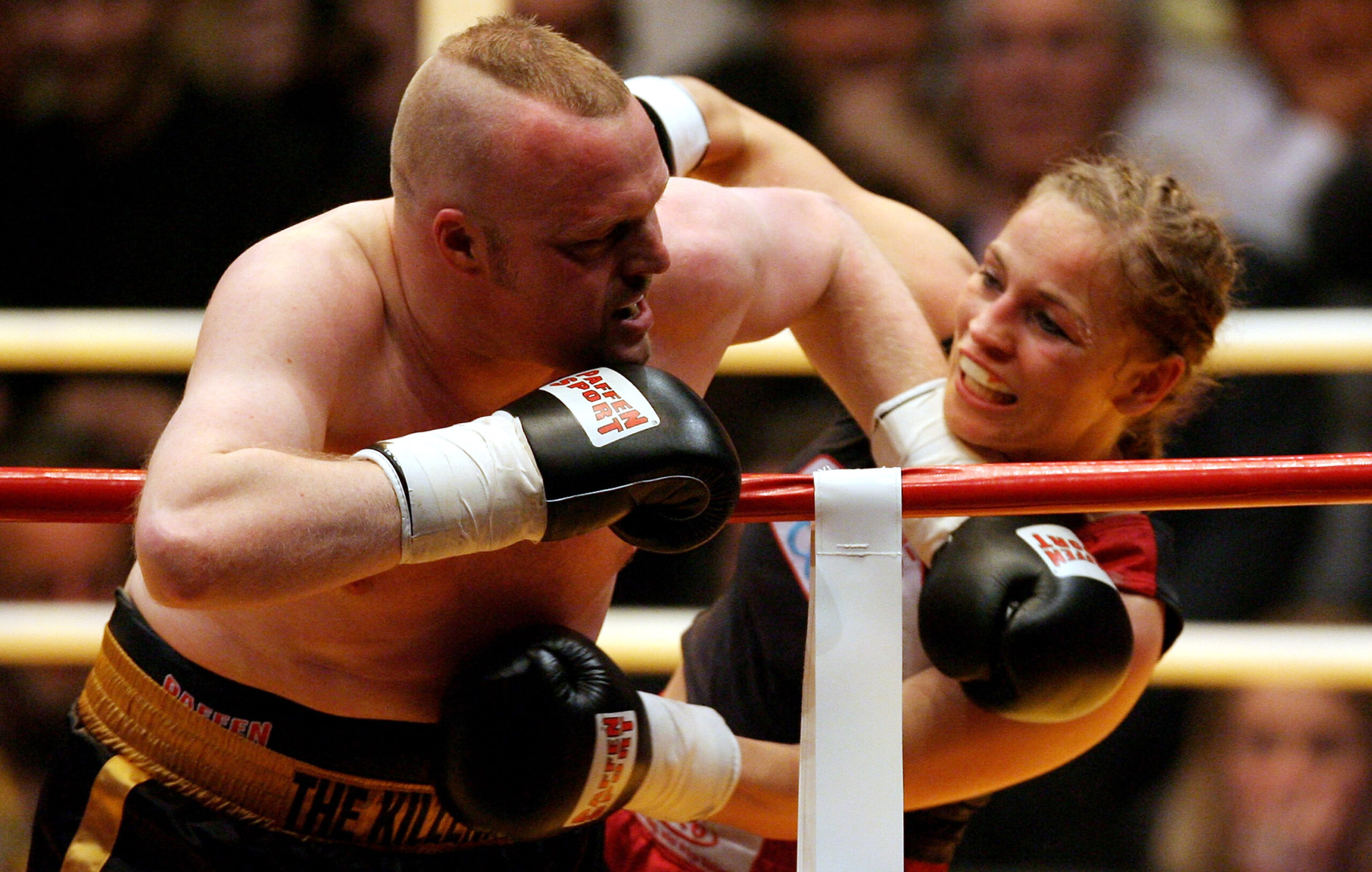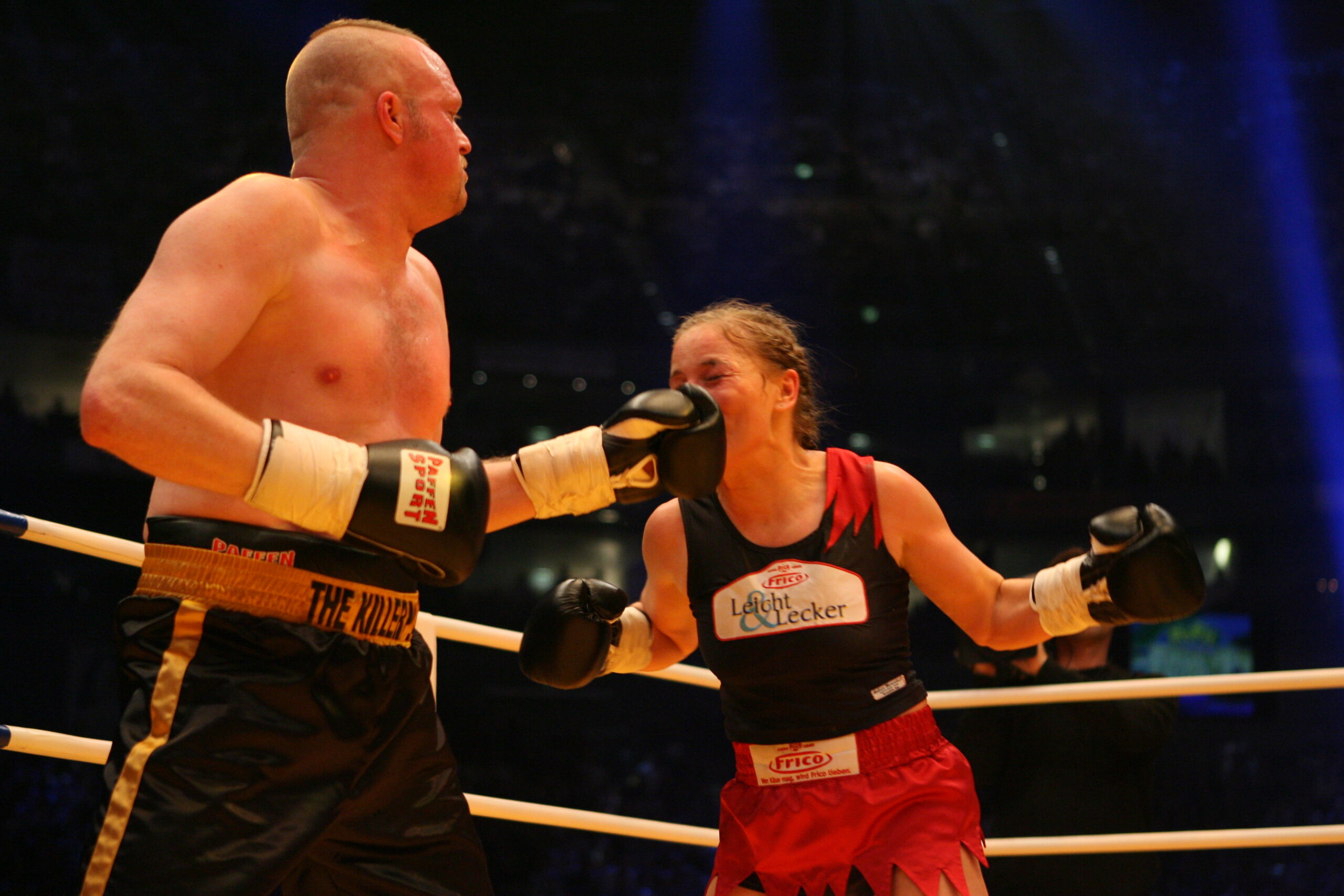 COLOGNE, GERMANY – MARCH 30: Regina Halmich (L) is hit by Stefan Raab during the showfight between Regina Halmich of Germany and entertainer Stefan Raab of Germany at the McFit Fight Night at the Cologne Arena on March 30, 2007 in Cologne, Germany. (Photo by Oliver Stratmann/Getty Images)