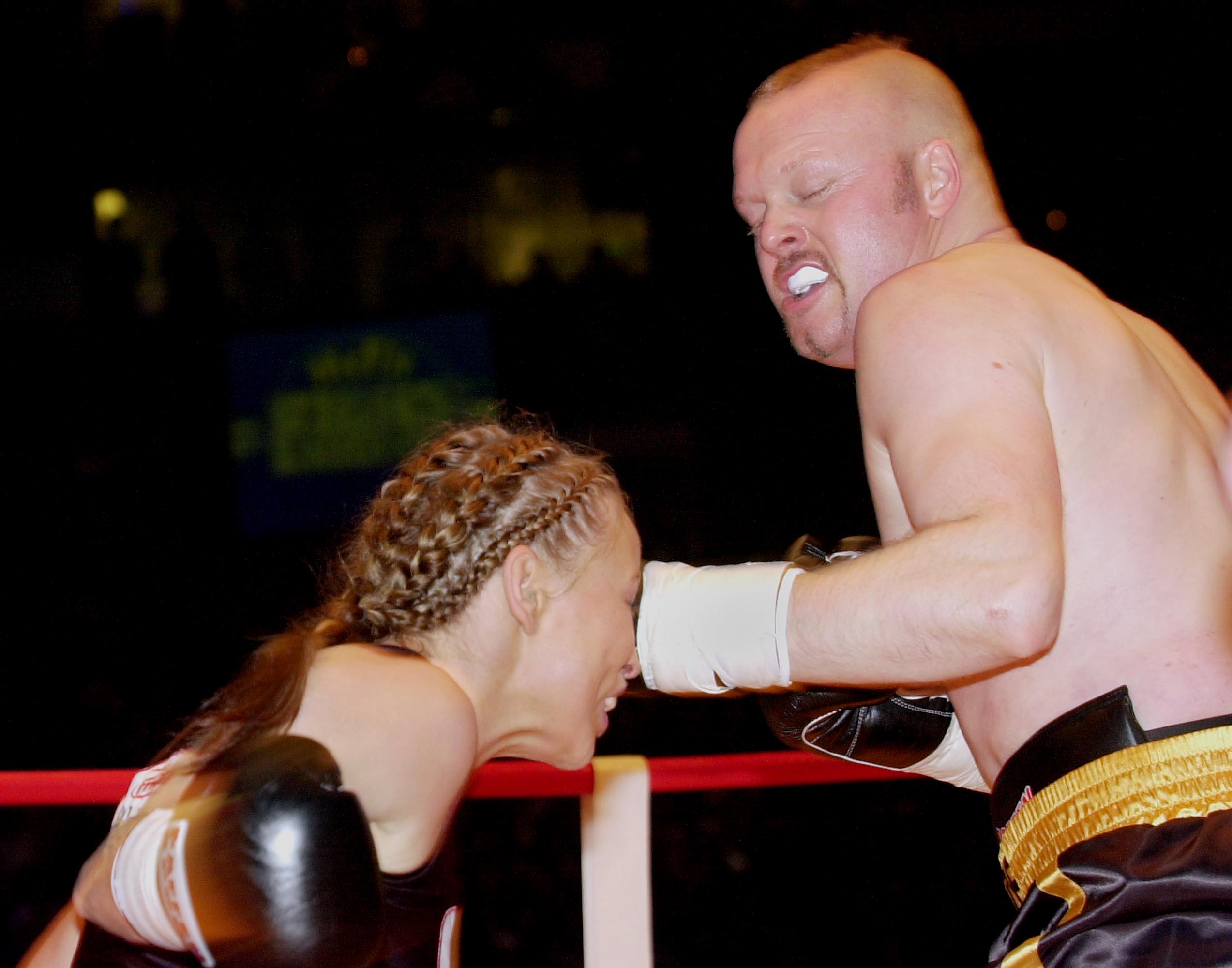 COLOGNE, GERMANY – MARCH 30: Stefan Raab punches Regina Halmich of Germany during the McFit Fight Night at the Koeln Arena on March 30, 2007 in Cologne, Germany. (Photo by Ralf Juergens/Getty Images)
