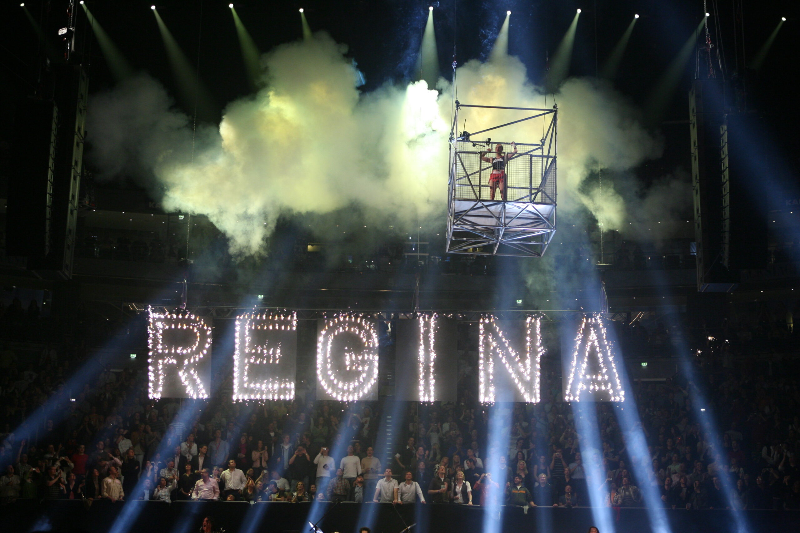 COLOGNE, GERMANY – MARCH 30: Stefan Raab watches Regina Halmich during the McFit Fight Night at the Koeln Arena on March 30, 2007 in Cologne, Germany. (Photo by Ralf Juergens/Getty Images)