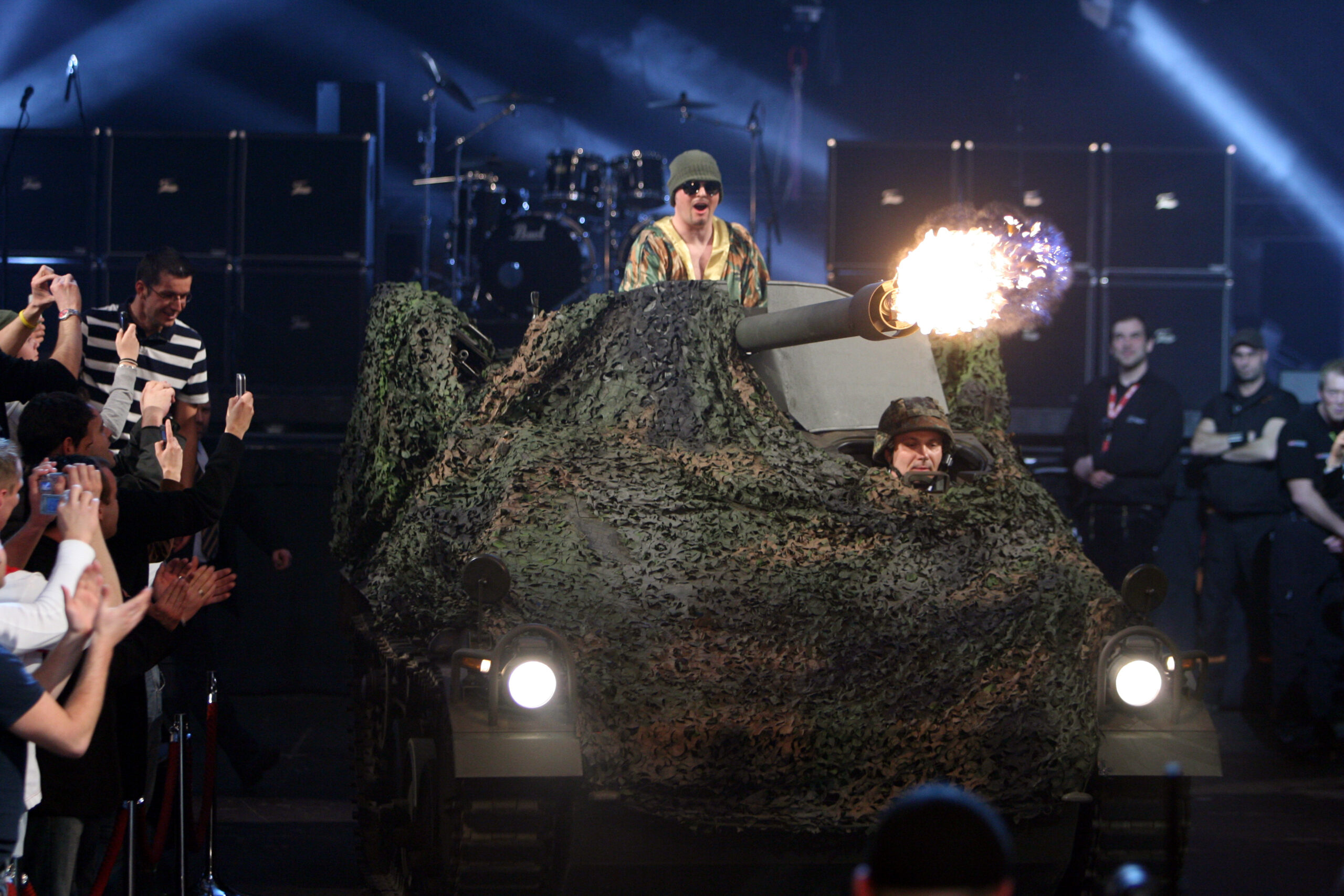 COLOGNE, GERMANY – MARCH 30: Stefan Raab arrives in a tank at the McFit Fight Night before his fight with boxer Regina Halmich of Germany at the Koeln Arena on March 30, 2007 in Cologne, Germany. (Photo by Ralf Juergens/Getty Images)