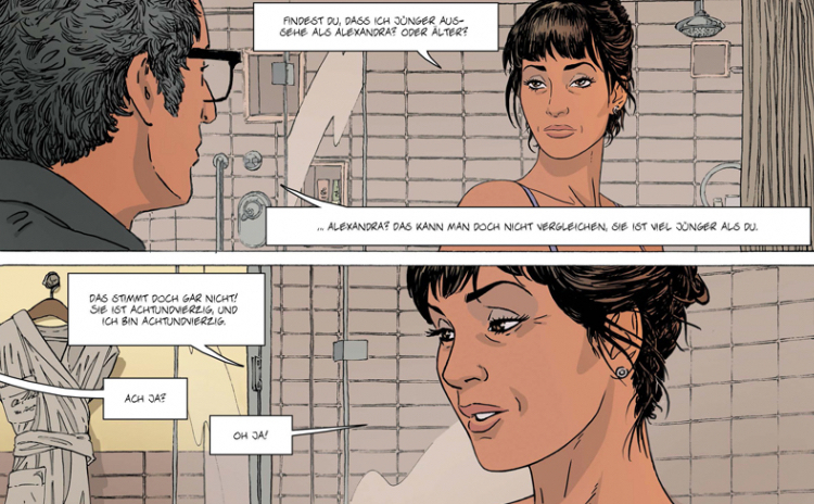 „Die Erektion“ von Texter Jim und Zeichner Lounis Chabane ist da schon etwas weiter. Der gestelzte und zunächst etwas plump daherkommende Titel verweist gerade nicht auf eine alberne Geschichte, die als Vorwand für erotische Zeichnungen dient (das kann im Moment sowieso niemand so gut wie Zep), sondern die zweibändige Graphic Novel erzählt die Geschichte eines etwas in die Jahre gekommenen Paars in Paris. Der Geburtstag der Frau, die mit gewisser Furcht dem Älterwerden begegnet, und die plötzliche Erektion zum falschen Zeitpunkt des Mannes, sorgt für einen Streit, der die Liebe der beiden in Frage stellt – aber auch den Raum öffnet, um neu über Zuneigung und Partnerschaft zu verhandeln. Überraschend erwachsen und unneurotisch.