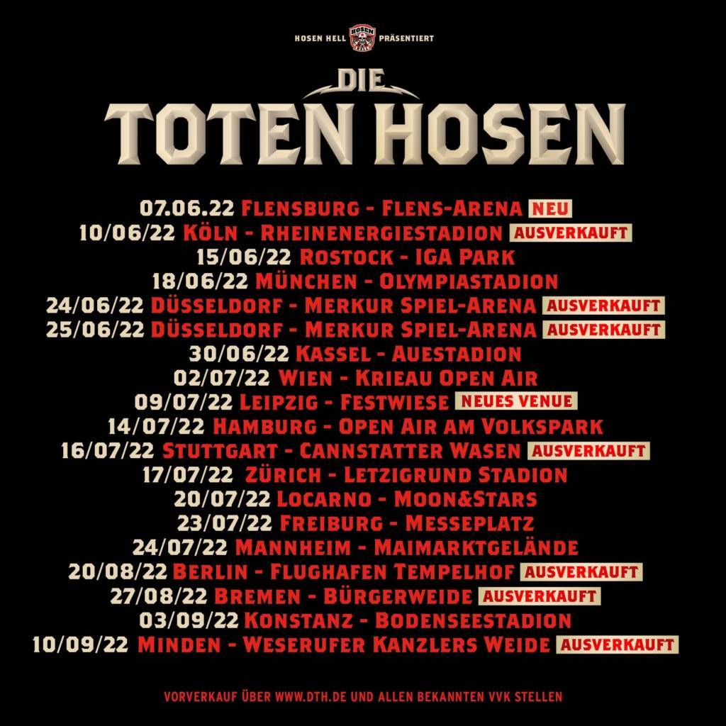 Die diesjährige Jubiläumstour der Toten Hosen erfreut sich großer Beliebtheit: Aus diesem Grund wurde die Großpösna-Show auf die Leipziger Festwiese verlegt. Ein weiterer Termin in Flensburg wurde der Liste hinzugefügt und die Berliner Show auf dem Flughafen Tempelhof ist bereits ausverkauft.