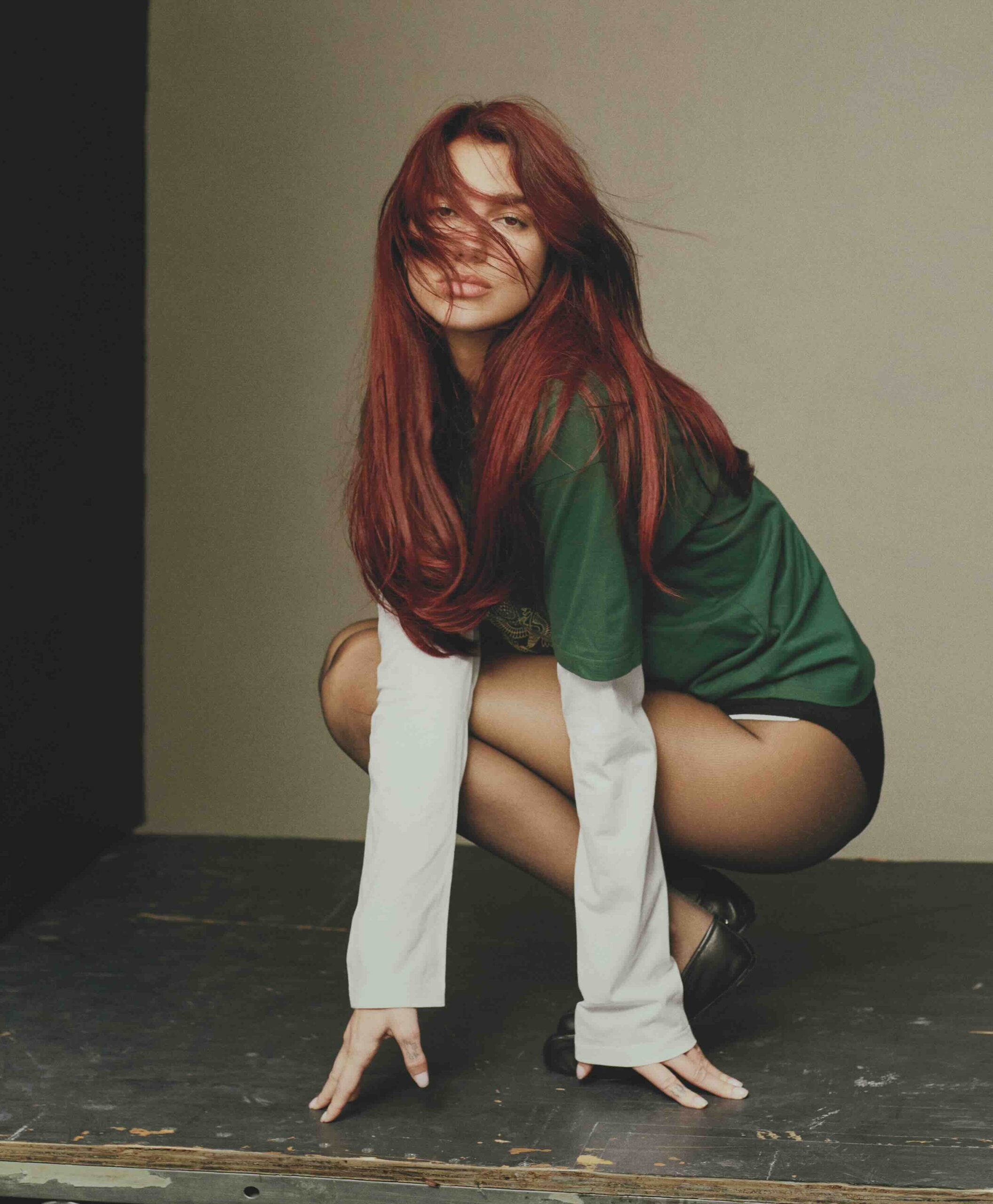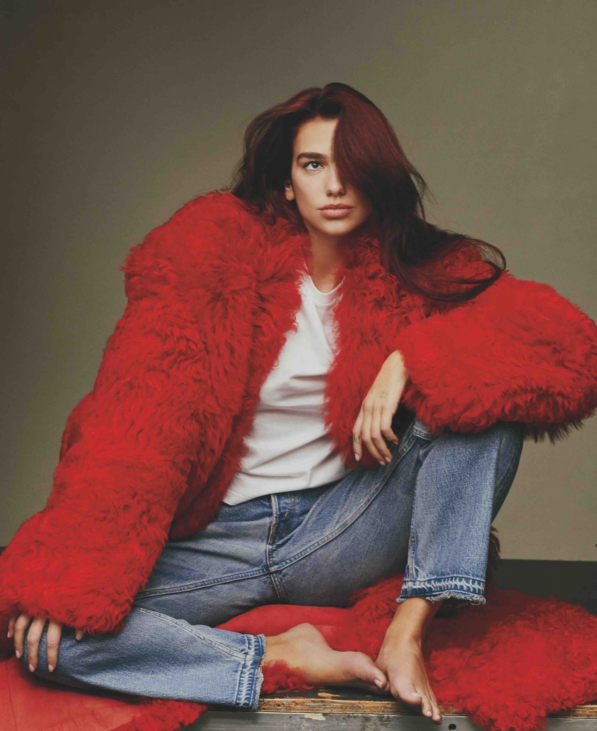 Lipa hat gerade eine Besprechung mit ihrem Team in einem anderen Teil des Hauses beendet und betritt das Wohnzimmer. Sie steckt mitten in einer Promophase, inklusive Radioauftritten, Fotoshootings und Social-Media-Posts. Sie trägt Jeans und ein Palace-Unitas-Sweatshirt, aber ihre Augen sind mit einem schweren Lidschatten geschminkt, den sie für einen Auftritt vor der Kamera am Morgen aufgelegt hat. Ihr rotes Haar ist bis auf zwei winzige, das Gesicht umrahmende Zöpfe offen.