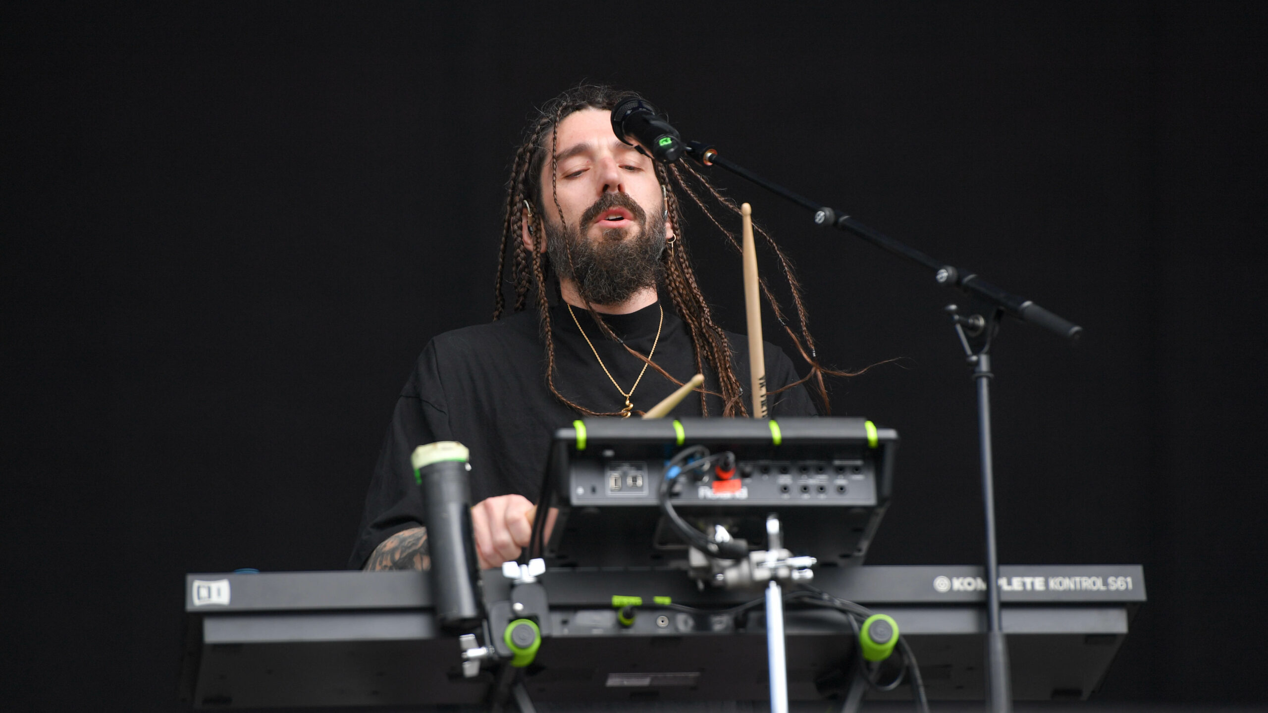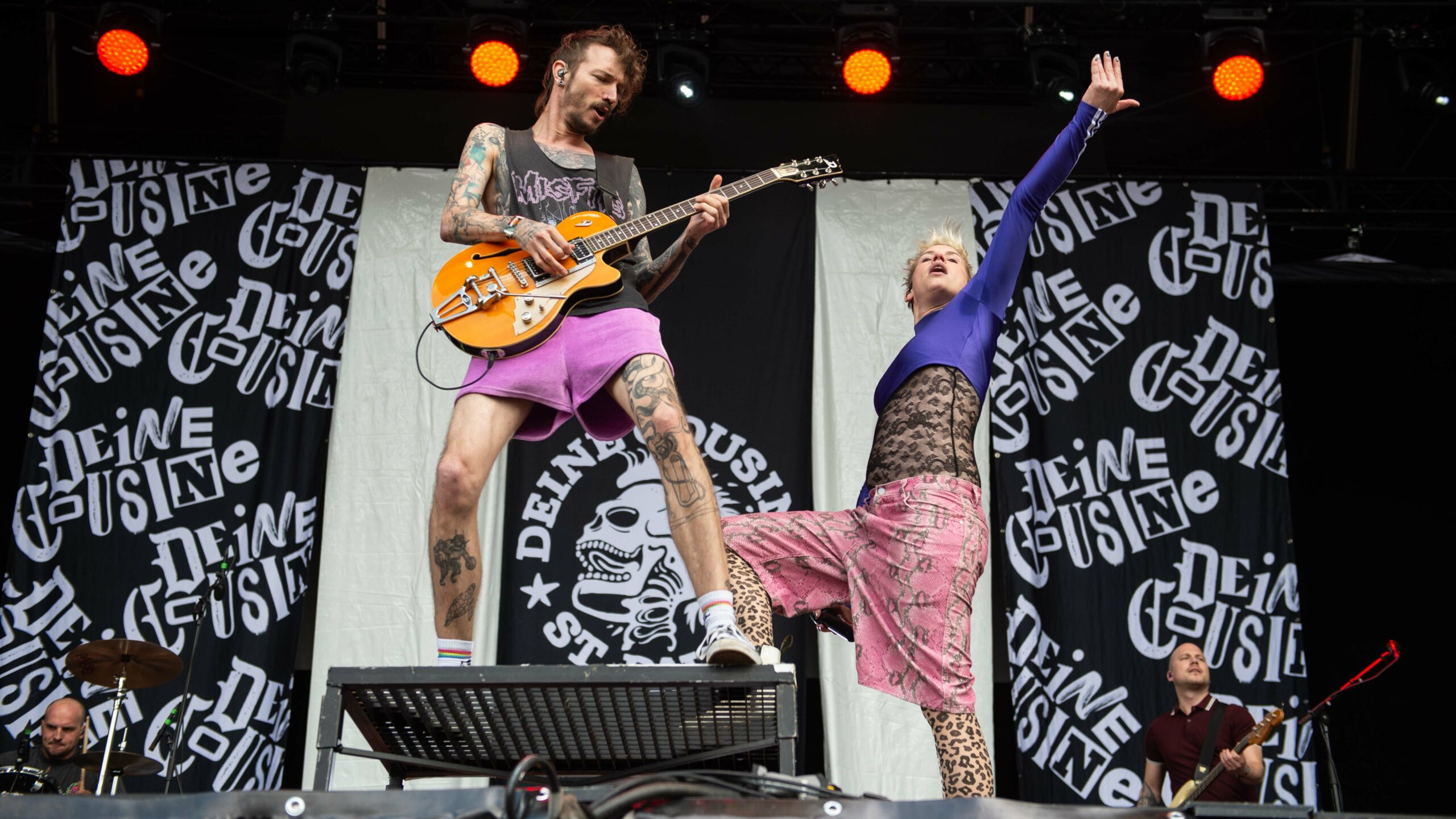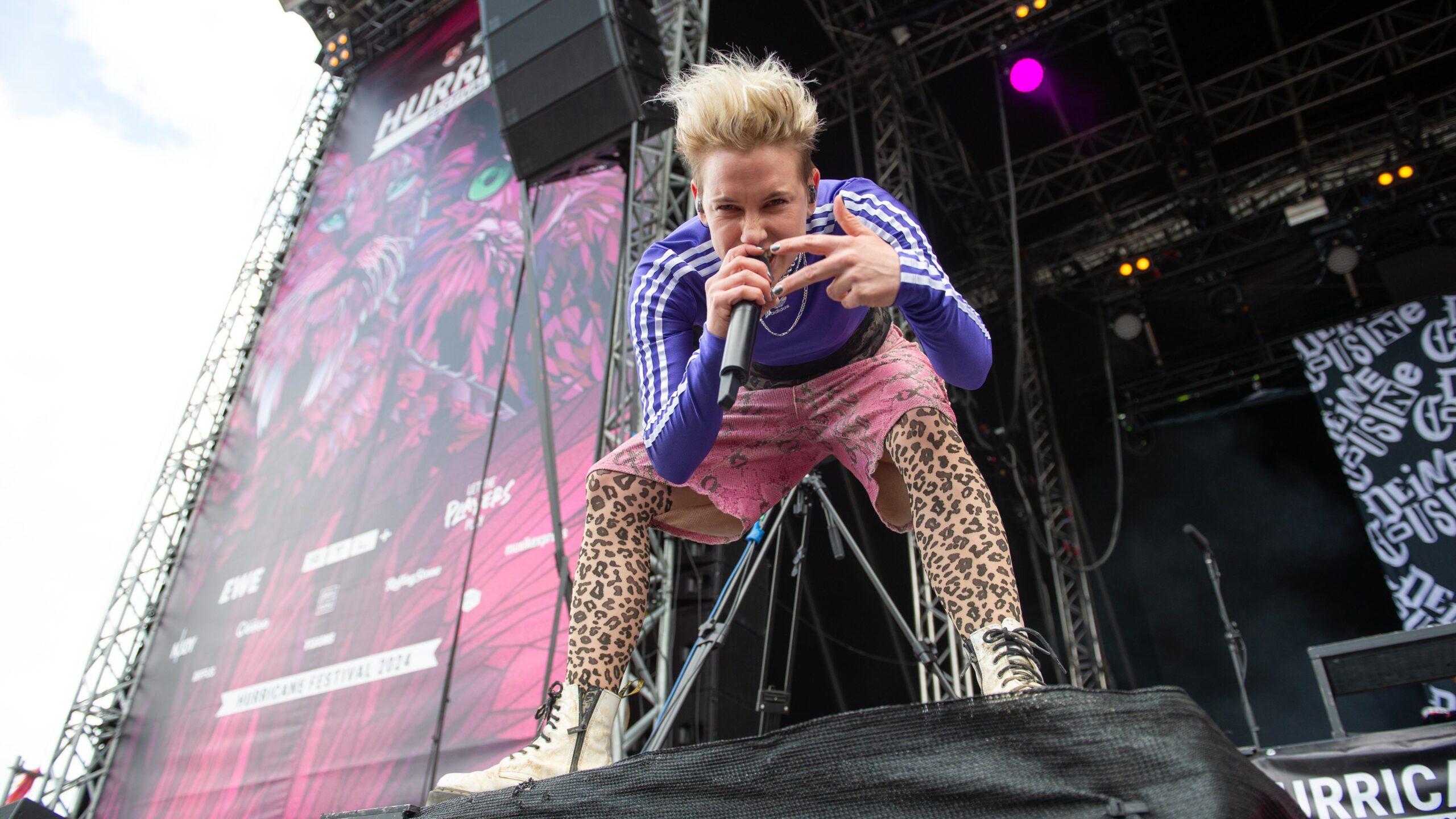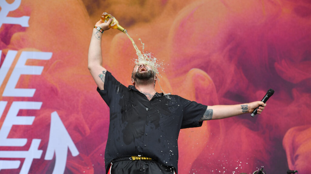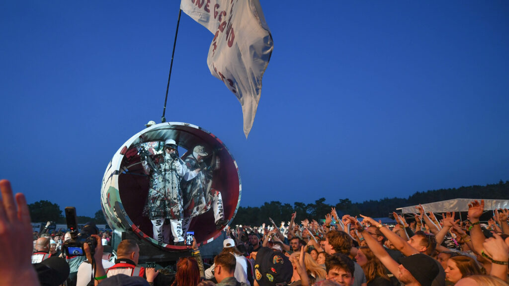 In den ersten Reihen vor der River Stage schwenkt ein Deichkind-Fan eine Fahne, die den Ton der Show angibt: „Kein Mensch ist illegal“ – und ja, die Welt ist fertig, aber „wir gönnen uns das Privileg der Hoffnung“. So rollen die Rapper zu „Bück dich hoch“ auf mit den Buchstaben „FCK AFD“ beklebten Bürostühlen über die Bühne, beeindrucken mit einstudierten Choreos und blinkenden Tetraeder-Helmen und gehen mit der Crowd ein paar Gesangsübungen durch. Auch wenn die FOMO angesichts der Deutschlandtrikot-Schwemme am Sonntag bei einigen Fußballfans sehr groß sein muss, will sich keiner diese Show entgehen lassen. Spätestens als das Fass reinrollt und sich seinen Weg durch die Menge bahnt, gibt es kein Halten mehr.