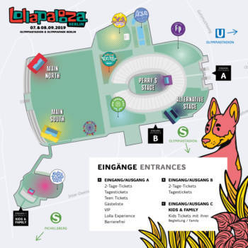 Das Lollapalooza Festival findet 2019 im Olympiastadion und umliegenden Olympiapark statt. Damit Sie sich bereits jetzt einen Eindruck vom Festivalgelände im Berliner Westend machen können, hier der offizielle Lageplan des diesjährigen Festivals.