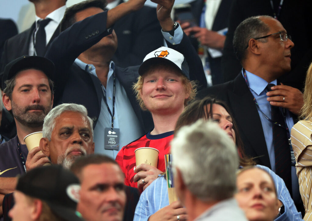 Ed Sheeran, der im englischen Halifax geboren wurde, hatte bereits am Eröffnungstag beim Fanfest in München vor 60.000 Fans ein Konzert gegeben. Schon damals zeigte er mit einem weißen Trikot der Three Lions, dass er natürlich für seine Heimat England jubeln würde. Heute (10.07.) trug er dagegen ein rotes Trikot und Basecap.