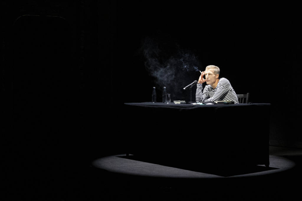 Stuckrad-Barre liefert an diesem Abend die eigene Rezeption vielfach mit. Er haut wiederholt Feuilleton-Lingo wie „Vexierspiel“ oder „Figuren-Verschränkungen“ raus, um den zahlreich anwesenden Kritikern und Kritikerinnen Erklärmodelle für seinen Stoff vorzuportionieren. Er trinkt Wasser und raucht wie ein Schlot. Er erzählt, dass der „Intendant“ ihm erlaubt habe, aus „dramaturgischen Gründen“ auf der Bühne zu rauchen. Er fordert Nikotin-Opfer im Publikum auf, es ihm gleichzutun und neben ihm eine zu quarzen. Aber, wie er witzelt: „Während der Fahrt nicht mit dem Fahrer sprechen.“ Sein „Lieblingsschild“. Alle lachen. Keiner traut sich ins Rampenlicht.