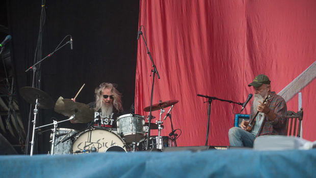 Das gilt auch für Seasick Steve, der am frühen Nachmittag auf der Green Stage seinen Hundehütten-Blues spielt, begleitet von einem ebenfalls langbärtigen Multiinstrumentalisten. John-Deere-Mütze, selbst gebaute Gitarren, Rotwein aus der Flasche: Da stehen zwei naturbelassene amerikanische Männer und spielen Musik von Gestern mit einer sehr gegenwärtigen Energie.