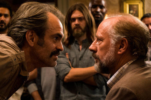 Zur aufgewerteten Besetzung der Staffel acht gehören der großartige Steven Ogg (Foto li., neben Xander Berkeley) als Simon, dazu die schreckliche Pollyanna McIntosh (Jadis) und die blasse Katelyn Nacon (Enid), deren Funktion bislang nur darin bestand, Carl Grimes gelegentlich den Kopf zu verdrehen.
